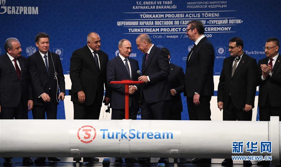 1月8日,在土耳其伊斯坦布尔,土耳其总统埃尔多安(左五)、俄罗斯总统普京(左四)、保加利亚总理鲍里索夫(左三)与塞尔维亚总统武契奇(右三)参加“土耳其溪”天然气管道通气仪式。新华社记者 徐速绘 摄