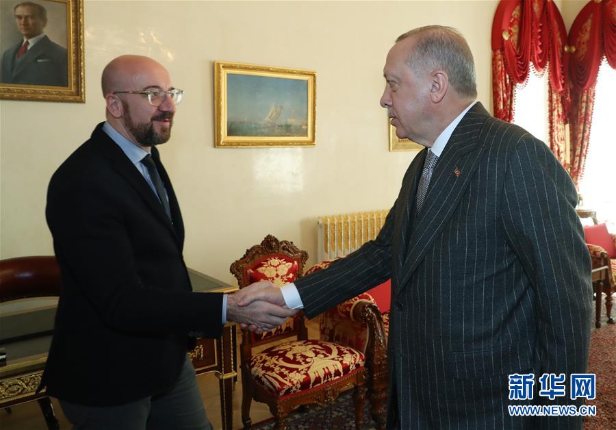 1月11日,土耳其总统埃尔多安(右)在伊斯坦布尔会见欧洲理事会主席米歇尔。 当日,土耳其总统埃尔多安在伊斯坦布尔会见欧洲理事会主席米歇尔,双方讨论了中东地区局势和土欧关系等问题。 新华社发(土耳其总统府供图)
