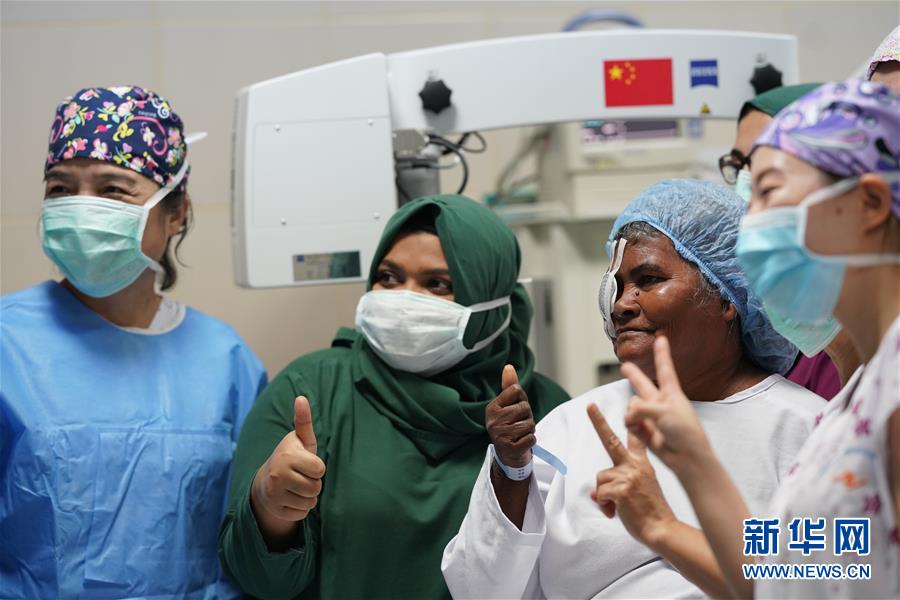 1月9日,在马尔代夫首都马累附近的胡鲁马累医院,一名患者做完手术后同来自两国的医护人员合影。