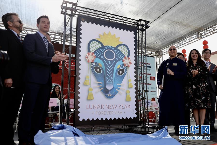 1月11日,在美国洛杉矶蒙特利公园市,嘉宾参加鼠年邮票揭幕仪式。 美国邮政局当日发行了农历鼠年生肖邮票和首日封。 新华社发