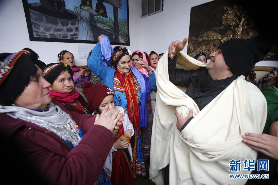 1月12日,在阿尔及利亚提济乌祖省一个村庄,柏柏尔人穿着民族服装庆祝柏柏尔新年。新华社发
