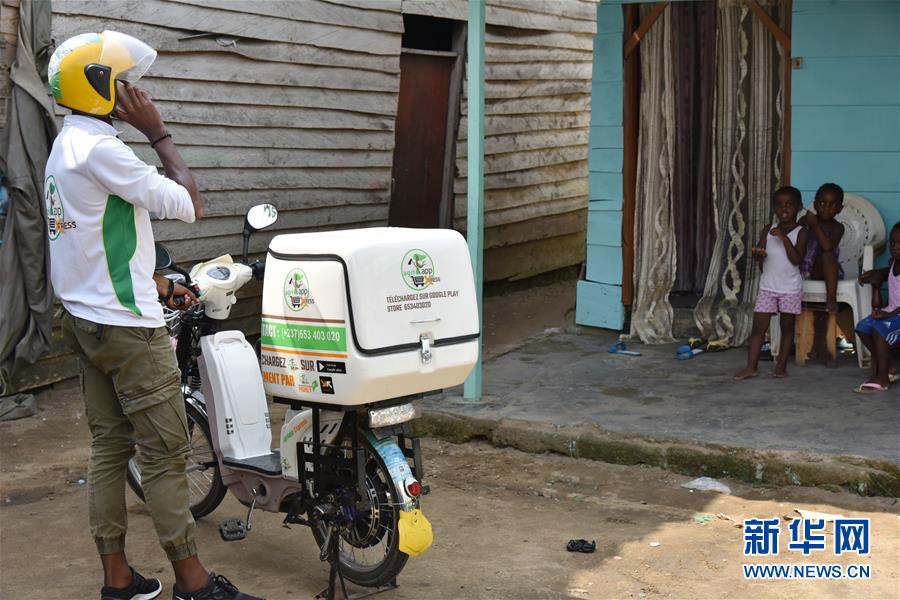 2019年12月4日,在喀麦隆杜阿拉,农产品电商手机应用AgriApp的快递员为用户配送活鱼。新华社发(科普索摄)