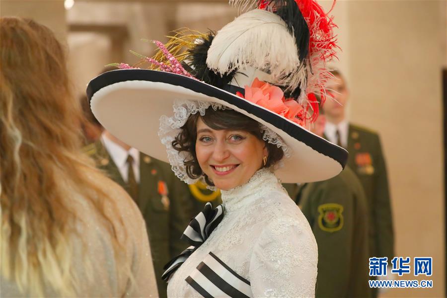 1月13日,在白俄罗斯首都明斯克,一位头戴礼帽的女士出席舞会。新华社发(任科夫摄)