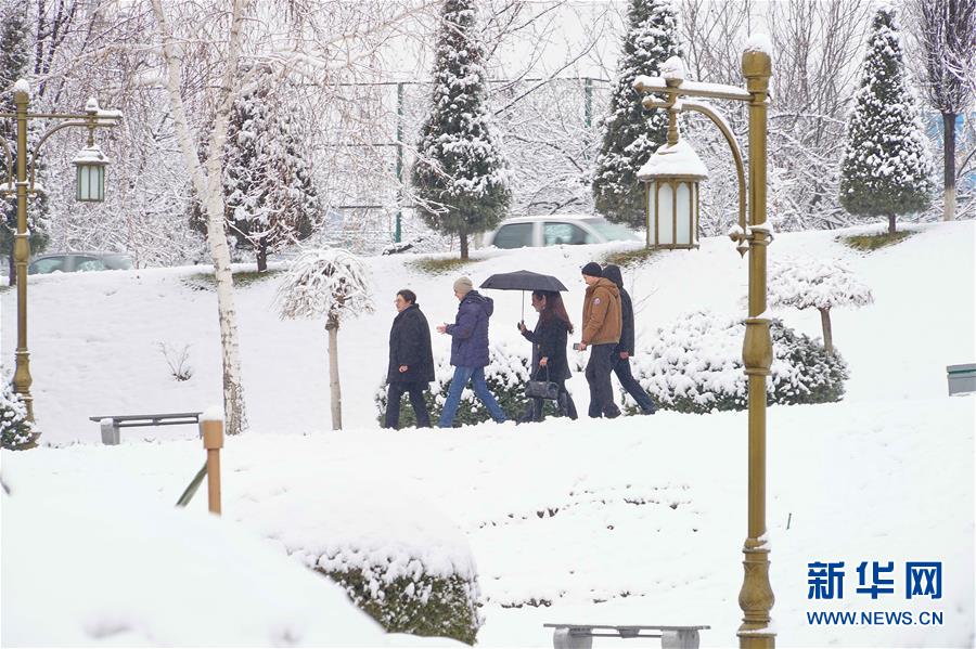 1月13日,在乌兹别克斯坦首都塔什干,人们在雪后出行。新华社发(扎法尔摄)