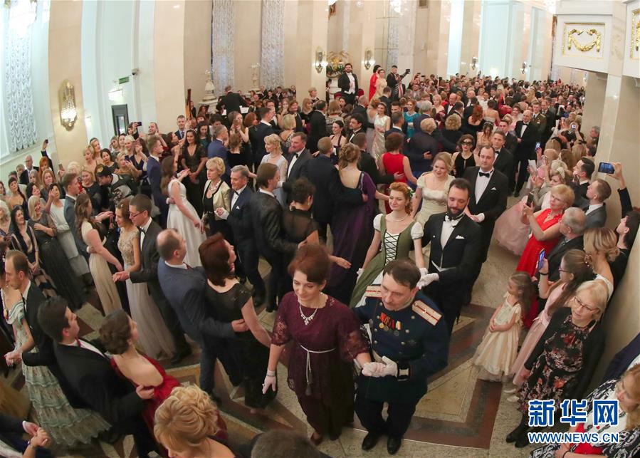 1月13日,在白俄罗斯首都明斯克,身着节日盛装的人们参加舞会。当日,白俄罗斯首都明斯克举办舞会,迎接俄历新年的到来。1月14日是俄历新年。新华社发(任科夫摄)