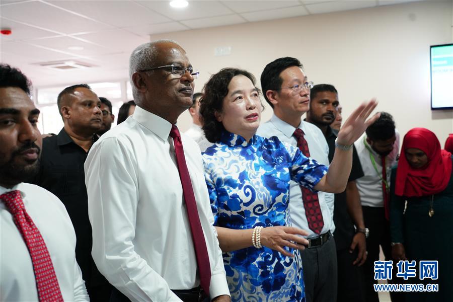 1月13日,在马尔代夫胡鲁马累医院,马尔代夫总统萨利赫(左三)在眼科中心参观。新华社记者 唐璐 摄