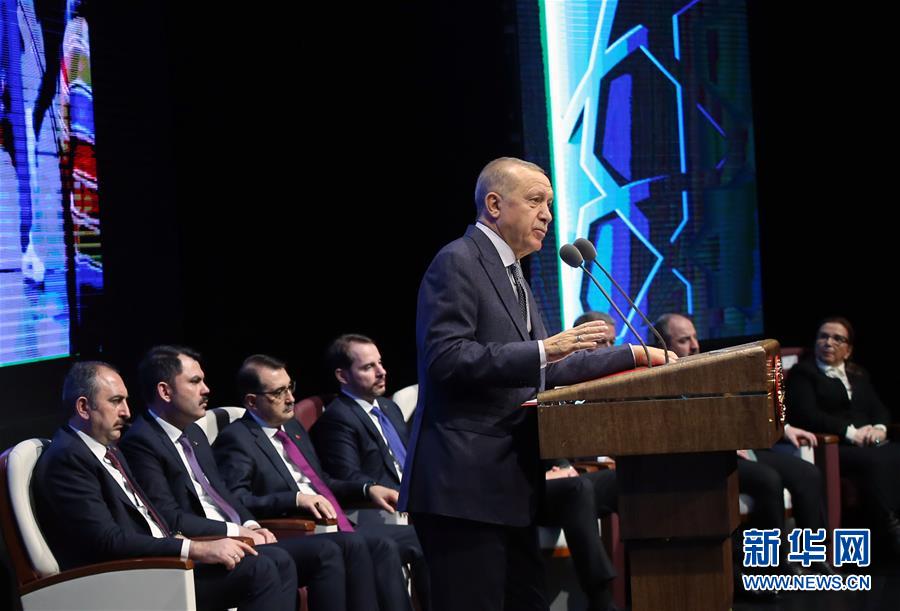 1月16日,土耳其总统埃尔多安(前)在安卡拉举行的2019年度总结大会上讲话。新华社发(穆斯塔法·卡亚摄)
