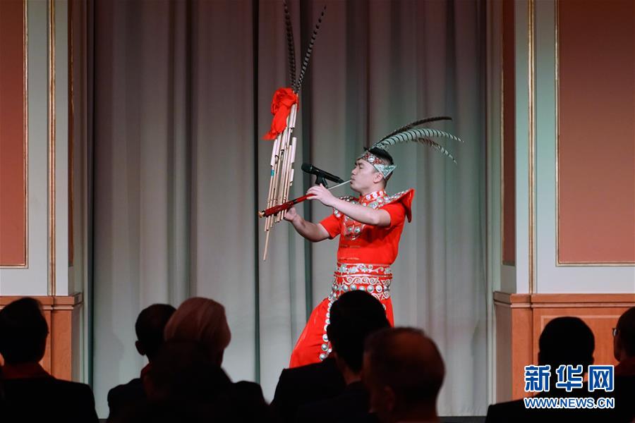1月15日,在德国柏林,贵州省歌舞剧院艺术团的演员在晚会上吹奏芦笙。 15日晚,2020年“欢乐春节”新春文艺晚会在德国柏林的红色市政厅上演,中德两国各界代表观看演出,共庆中国农历新年。 新华社记者 王勍 摄