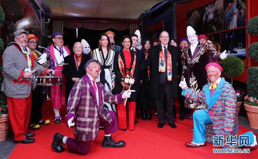 1月16日,在摩纳哥蒙特卡洛,摩纳哥元首阿尔贝二世亲王(第二排右二)、公主斯蒂芬妮(第二排右三)等出席第44届蒙特卡洛国际马戏节。 第44届蒙特卡洛国际马戏节16日在摩纳哥开幕。来自中国、瑞士、俄罗斯等16个国家和地区的演员们将在马戏节期间表演约30个节目,参与角逐马戏节最高奖项“金小丑”奖。 新华社记者 高静 摄