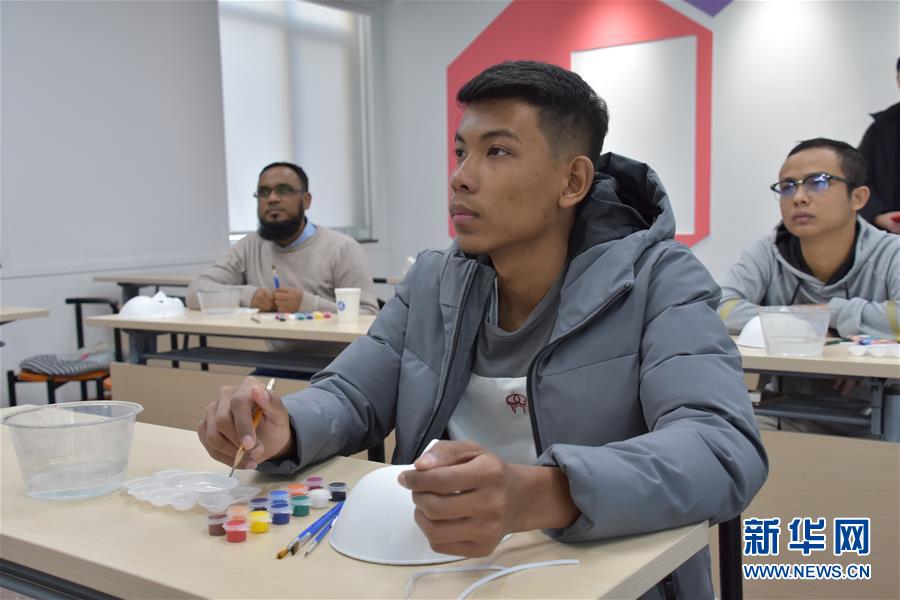 1月14日,池特(前)在听老师讲解如何画脸谱。 新华社记者 宋瑞 摄