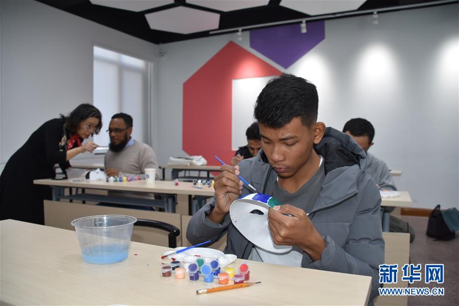 1月14日,池特(前)在课堂上画脸谱。 新华社记者 宋瑞 摄