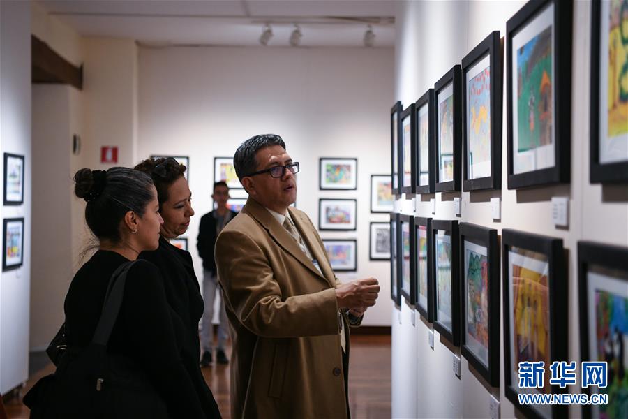 1月16日,在墨西哥首都墨西哥城,观众在作品展上欣赏绘画作品。 第六届“我想象中的中国”儿童绘画比赛颁奖仪式暨作品展开幕式16日在墨西哥国立世界多元文化博物馆举行。本届比赛以“中国之旅”为主题,充分激发参赛儿童对中国的想象力,面向6至12岁当地儿童,共征集作品602幅,其中120幅作品入选。 新华社记者 辛悦卫 摄