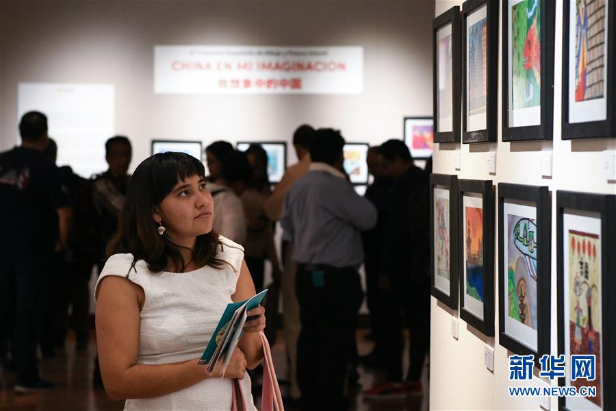 1月16日,在墨西哥首都墨西哥城,观众在作品展上欣赏绘画作品。 第六届“我想象中的中国”儿童绘画比赛颁奖仪式暨作品展开幕式16日在墨西哥国立世界多元文化博物馆举行。本届比赛以“中国之旅”为主题,充分激发参赛儿童对中国的想象力,面向6至12岁当地儿童,共征集作品602幅,其中120幅作品入选。 新华社记者 辛悦卫 摄