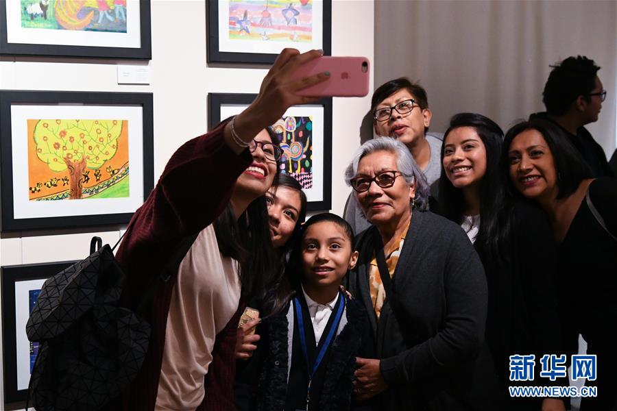 1月16日,在墨西哥首都墨西哥城,一名参赛儿童(左三)在作品展上与家人合影。 第六届“我想象中的中国”儿童绘画比赛颁奖仪式暨作品展开幕式16日在墨西哥国立世界多元文化博物馆举行。本届比赛以“中国之旅”为主题,充分激发参赛儿童对中国的想象力,面向6至12岁当地儿童,共征集作品602幅,其中120幅作品入选。 新华社记者 辛悦卫 摄