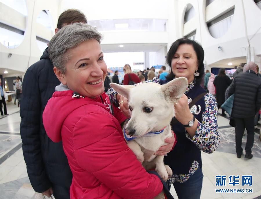 1月18日,在白俄罗斯首都明斯克,一名女子抱着宠物狗参加活动。 新华社发(任科夫摄)