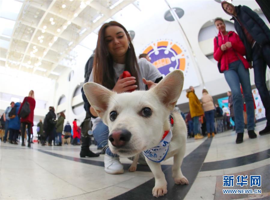 1月18日,在白俄罗斯首都明斯克,一名女子牵着宠物狗参加活动。 新华社发(任科夫摄)