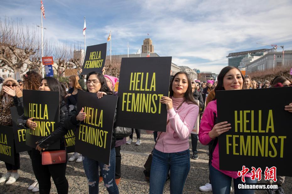 当地时间1月18日,数千人走上旧金山街头,参与第四届“女性大游行”。当日,“女性大游行”在美国多地展开。美国“女性大游行”2017年初首次举行。游行参与者呼吁保护和提升女性权益,更多关注性别歧视、种族歧视、社会不公等一系列问题。中新社记者 刘关关 摄