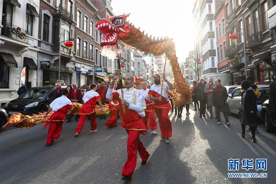 1月18日,在比利时列日,舞龙队在盛装巡游上表演。 由盛装巡游、文化庙会和文艺演出三大板块组成的“欢乐春节”系列活动18日在比利时东部重镇列日市隆重举行,来自比利时各地的华侨华人与当地民众共同感受浓浓的中国年味。 新华社记者 郑焕松 摄