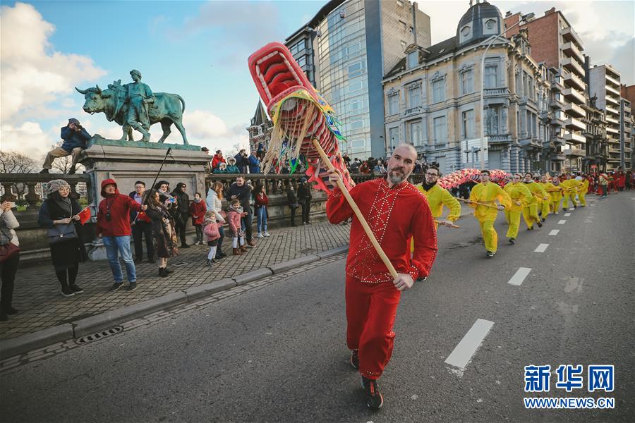 1月18日,在比利时列日,演员在盛装巡游中表演舞龙。 由盛装巡游、文化庙会和文艺演出三大板块组成的“欢乐春节”系列活动18日在比利时东部重镇列日市隆重举行,来自比利时各地的华侨华人与当地民众共同感受浓浓的中国年味。 新华社记者 张铖 摄