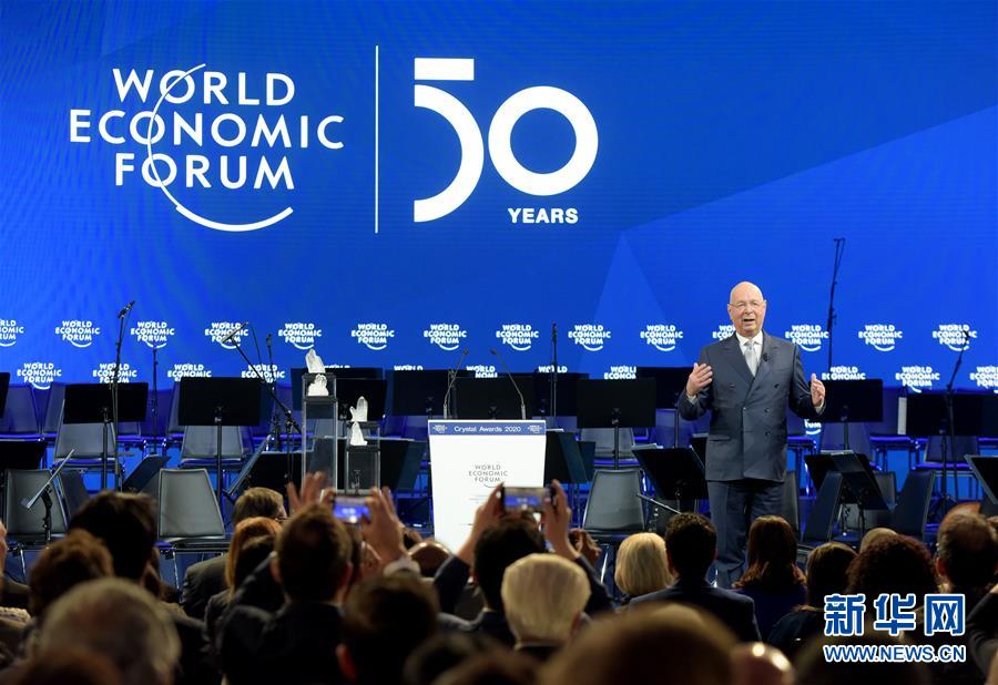 1月20日,在瑞士小镇达沃斯,世界经济论坛创始人兼执行主席克劳斯·施瓦布发表欢迎致辞。 当日,世界经济论坛在瑞士小镇达沃斯举行50周年庆祝活动。 新华社记者 郭晨 摄