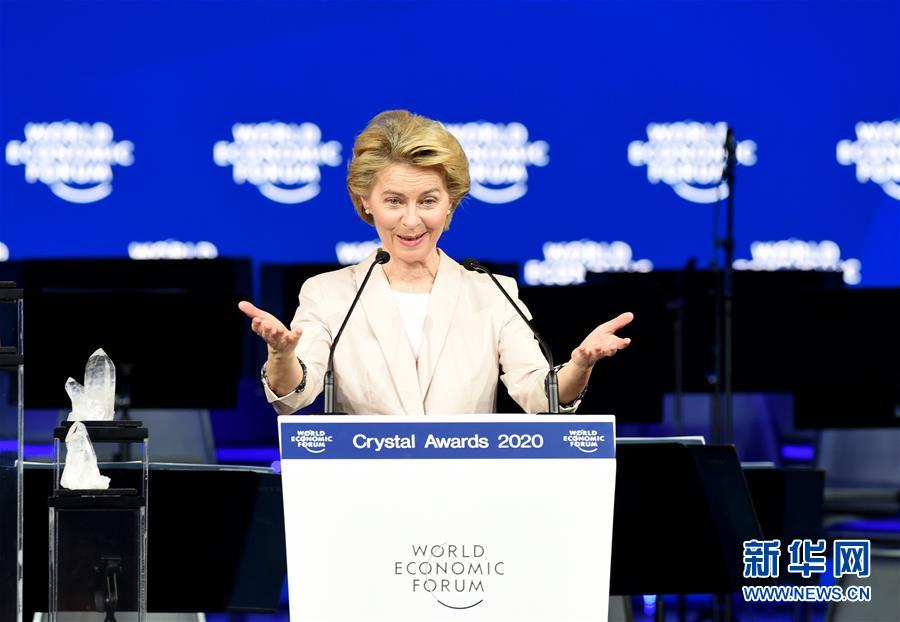 1月20日,在瑞士小镇达沃斯,欧盟委员会主席冯德莱恩致辞祝贺世界经济论坛50周年。 当日,世界经济论坛在瑞士小镇达沃斯举行50周年庆祝活动。 新华社记者 郭晨 摄