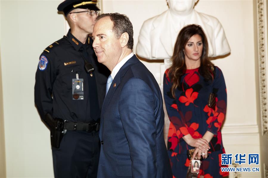 1月21日,在美国华盛顿,美国众议院情报委员会主席希夫(前)前往参议院。 当日,美国国会参议院开始正式审理针对总统特朗普的弹劾案,首日焦点是就弹劾案审理流程决议草案进行辩论和投票。 新华社发(沈霆 摄)