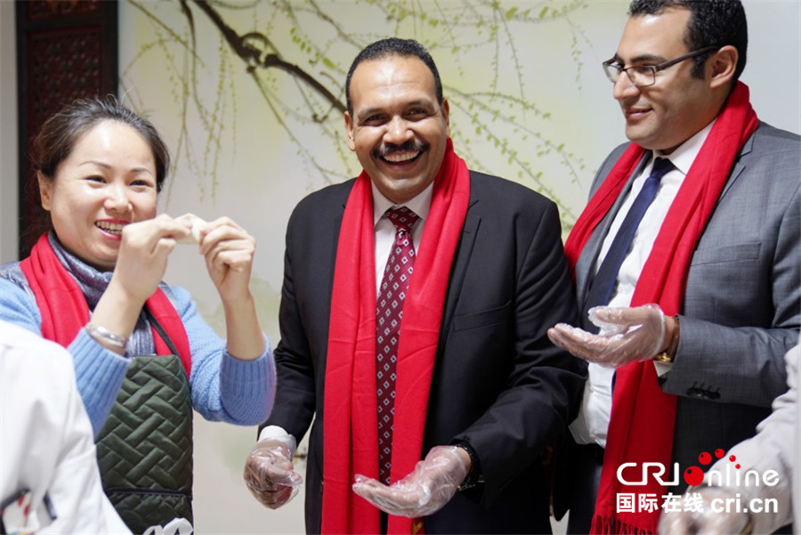 参与欢庆中国农历新年的埃及嘉宾在活动现场体验包饺子。