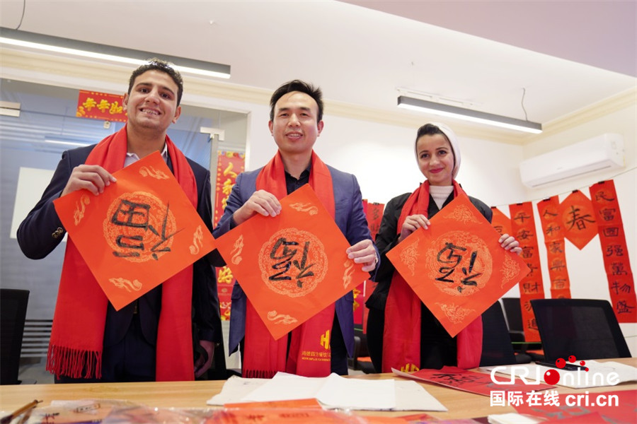 埃及青年与埃及中国学联会长摆克成(图中)一同写“福”,欢庆中国农历新年。