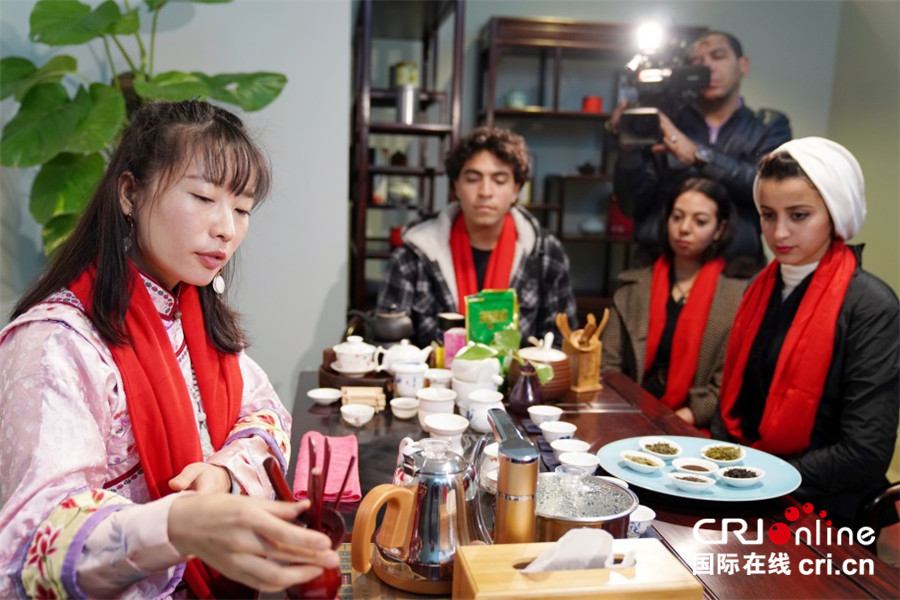 埃及青年欢庆中国农历新年,体验中国茶艺。