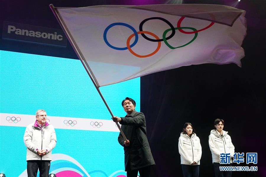 1月22日,下一届冬青奥会举办地韩国江原道的代表(左二)在闭幕式上挥舞奥运五环旗。 当日,第三届冬季青年奥林匹克运动会在瑞士洛桑闭幕。 新华社记者张晨霖摄