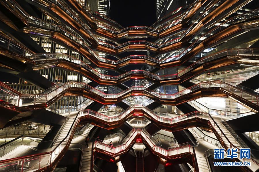 1月22日,在美国纽约哈得孙城市广场,地标建筑“Vessel”内亮起红色灯光庆祝中国春节。 新华社记者 王迎 摄