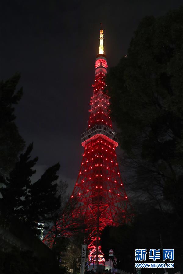 这是1月24日在日本东京拍摄的亮起“中国红”的东京塔。 当日,日本东京地标建筑东京塔为庆祝中国农历新年,亮起特别的“中国红”。在东京塔下,同时举办大锅煮水饺、舞狮表演和赏花灯等活动。 新华社记者 杜潇逸 摄
