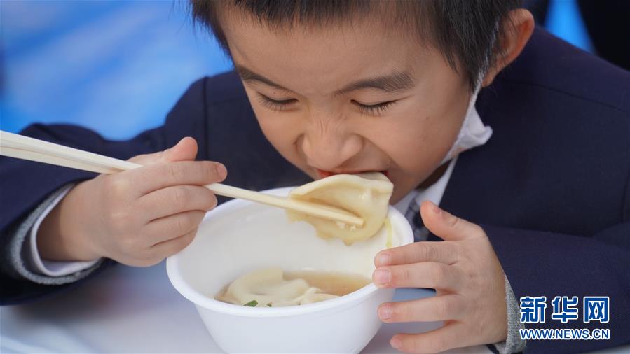 1月24日,在日本东京塔下,一名小朋友在活动现场吃水饺。 当日,日本东京地标建筑东京塔为庆祝中国农历新年,亮起特别的“中国红”。在东京塔下,同时举办大锅煮水饺、舞狮表演和赏花灯等活动。 新华社记者 郭威 摄