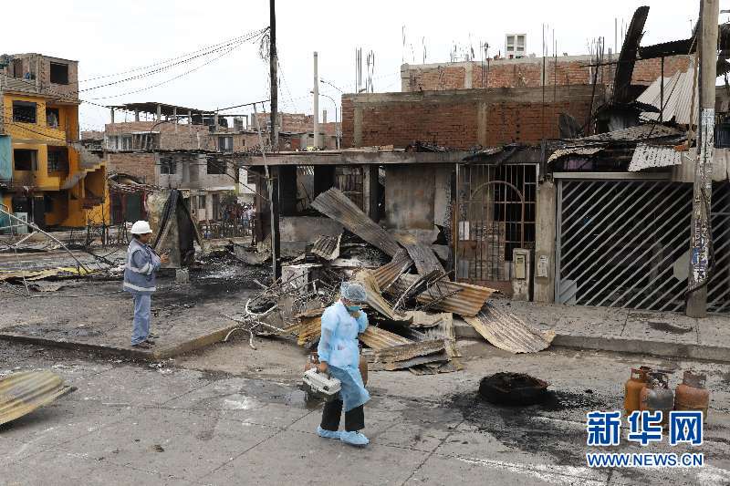 1月23日,在秘鲁首都利马,工作人员在液化天然气运输车爆炸事故现场工作。 秘鲁医疗卫生机构24日说,利马23日发生的液化天然气运输车爆炸事故已造成8人死亡。 新华社发(玛利亚娜·巴索摄)