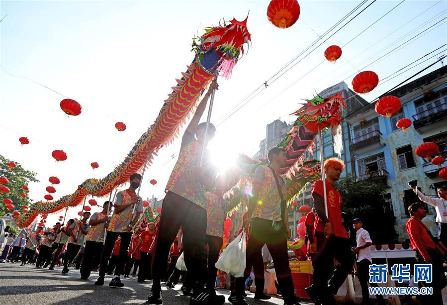 1月25日,在缅甸仰光唐人街,演员在庆新春活动上表演舞龙。 当日,缅甸仰光举办活动庆祝中国农历鼠年新春的到来。 新华社发(吴昂摄)