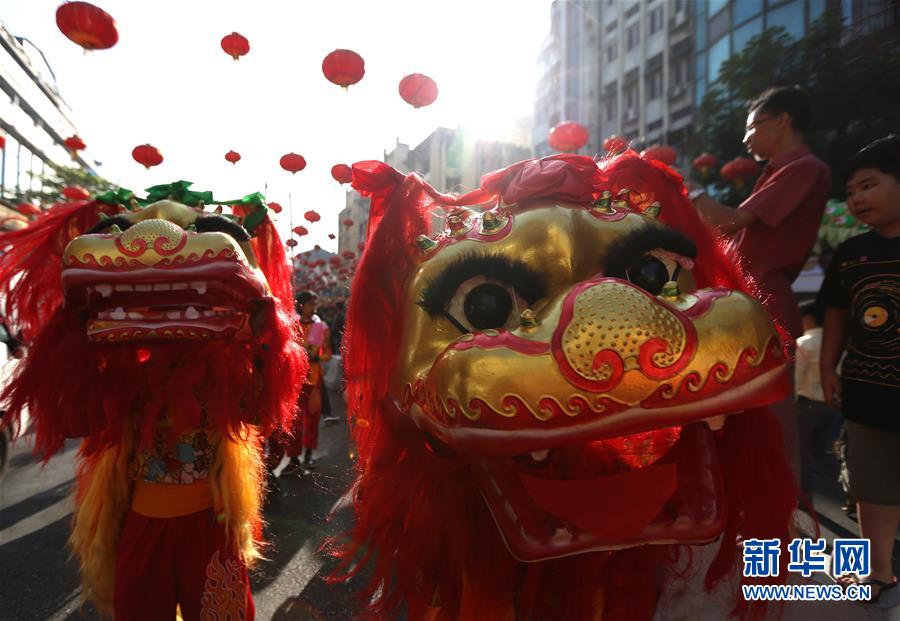 1月25日,在缅甸仰光唐人街,演员在庆新春活动上表演舞狮。 当日,缅甸仰光举办活动庆祝中国农历鼠年新春的到来。 新华社发(吴昂摄)