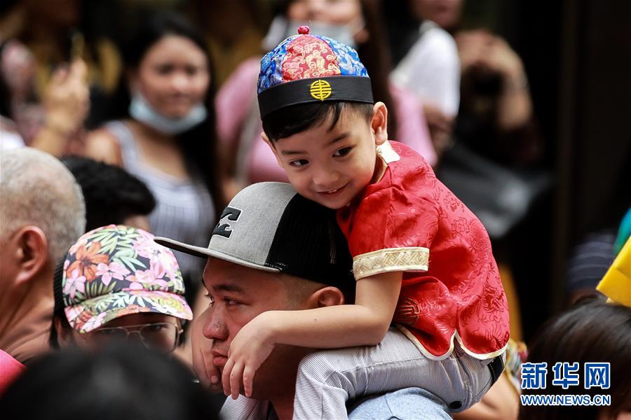 1月25日,在菲律宾首都马尼拉,一名身着中国传统服饰的男孩骑在大人的肩头,参加庆新春活动。 为了迎接1月25日的中国农历鼠年新春,全世界不同地区的人们举行了形式多样的庆祝活动。 新华社发(乌马利摄)