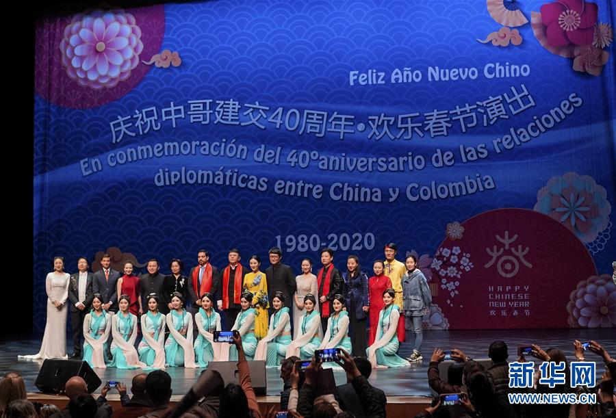 1月24日晚,在哥伦比亚首都波哥大,庆祝中哥建交40周年·欢乐春节演出结束后,来自中国歌剧舞剧院的演员与嘉宾登台合影。 为了迎接1月25日的中国农历鼠年新春,全世界不同地区的人们举行了形式多样的庆祝活动。 新华社发(约翰·帕斯摄)