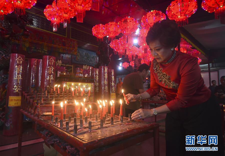 1月24日晚,人们来到印度尼西亚首都雅加达的寺庙中烧香祈福。 为了迎接1月25日的中国农历鼠年新春,全世界不同地区的人们举行了形式多样的庆祝活动。 新华社发(祖卡南摄)