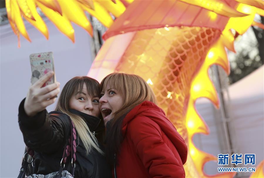 1月24日,游人们在塞尔维亚首都贝尔格莱德举行的第二届中国春节灯展上自拍留念。 为了迎接1月25日的中国农历鼠年新春,全世界不同地区的人们举行了形式多样的庆祝活动。 新华社记者 石中玉 摄