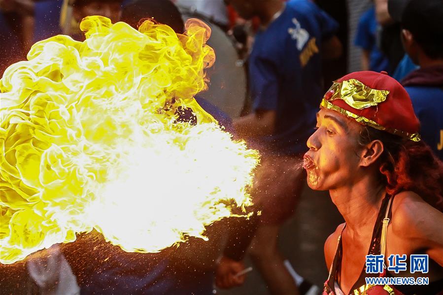 1月25日,在菲律宾马尼拉,演员在庆新春活动上表演喷火。 当日,菲律宾马尼拉举办活动庆祝中国农历鼠年新春的到来。 新华社发(乌马利摄)