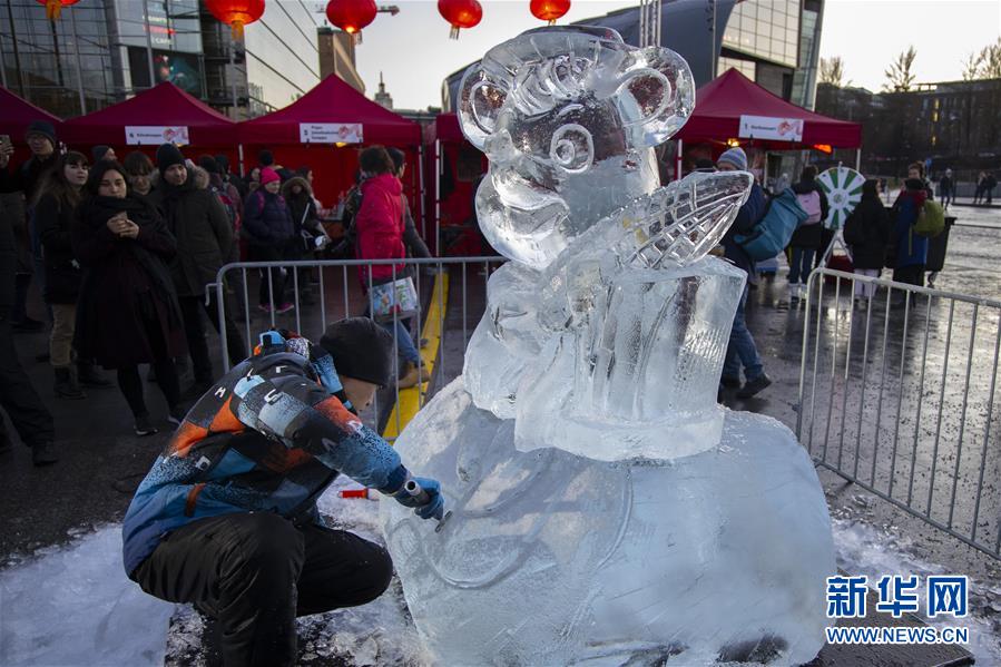 1月24日,在芬兰赫尔辛基公民广场上,工作人员在现场加工中国鼠年“鼠”元素冰雕作品。 1月24日是中国农历大年三十,大量赫尔辛基市民及游客来到市中心的公民广场,在“欢乐春节·赫尔辛基庙会”上体验中国年味儿,欣赏来自中国北京市及当地的文艺团体带来的精彩演出。“欢乐春节·赫尔辛基庙会”已连续举办了十四届,成为当地知名节庆活动。 新华社发(马蒂·马蒂凯宁摄)
