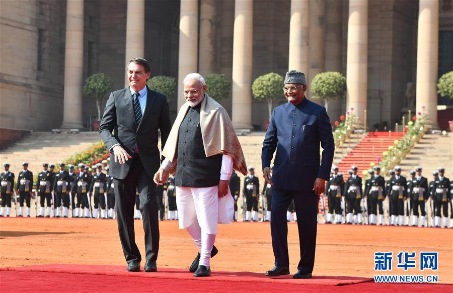 1月25日,印度总统科温德(右)与印度总理莫迪(中)在首都新德里欢迎巴西总统博索纳罗。 巴西总统博索纳罗访问印度,并将作为主要嘉宾出席26日印度“共和国日”的庆祝活动。 新华社发(帕塔·萨卡尔摄)
