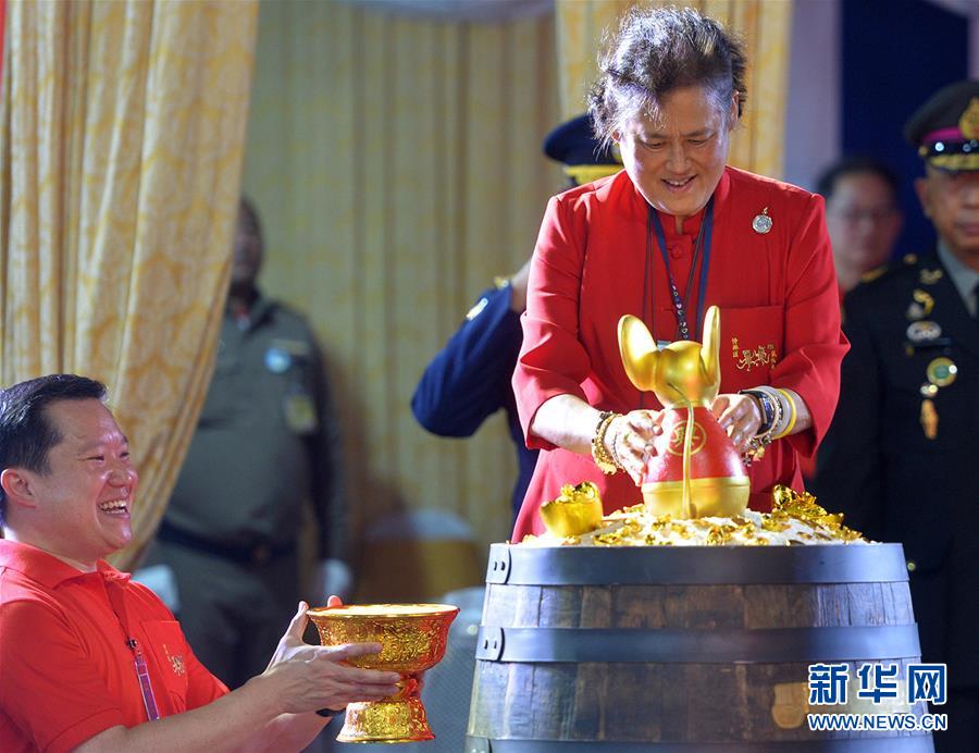 1月25日,在泰国曼谷,泰国诗琳通公主(前右)在唐人街出席“欢乐春节”活动开幕式时将鼠年吉祥物放在米桶上。 当日,泰国“欢乐春节”文化活动在曼谷唐人街拉开帷幕。 新华社发(拉亨 摄)