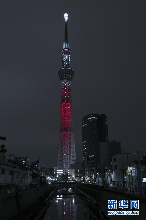 1月25日,日本东京著名地标建筑晴空塔点亮“中国红”。 为庆祝中国春节,晴空塔25日晚点亮“中国红”,吸引大批在日华侨华人及中国游客前往观看。 新华社记者 杜潇逸 摄
