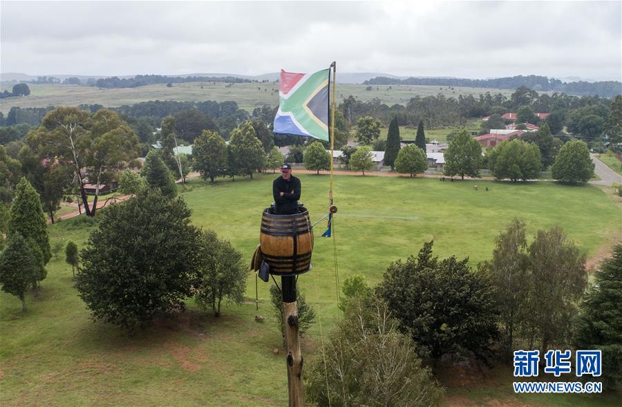 1月25日,在南非德尔斯特鲁姆小镇上,弗农·克鲁格站在木桶内(无人机拍摄)。 在距离约翰内斯堡以东300公里左右的德尔斯特鲁姆小镇上,52岁南非籍男子弗农·克鲁格于2019年11月14日开始再次挑战自己于1997年创造的在距离地面25米高木桶内居住54天的吉尼斯世界纪录。截至1月25日,他已经成功在木桶内居住72天,打破了自己创造的吉尼斯世界纪录。据悉,2月1日,他打算结束挑战,乘小型直升飞机回到地面。 新华社记者 陈诚 摄