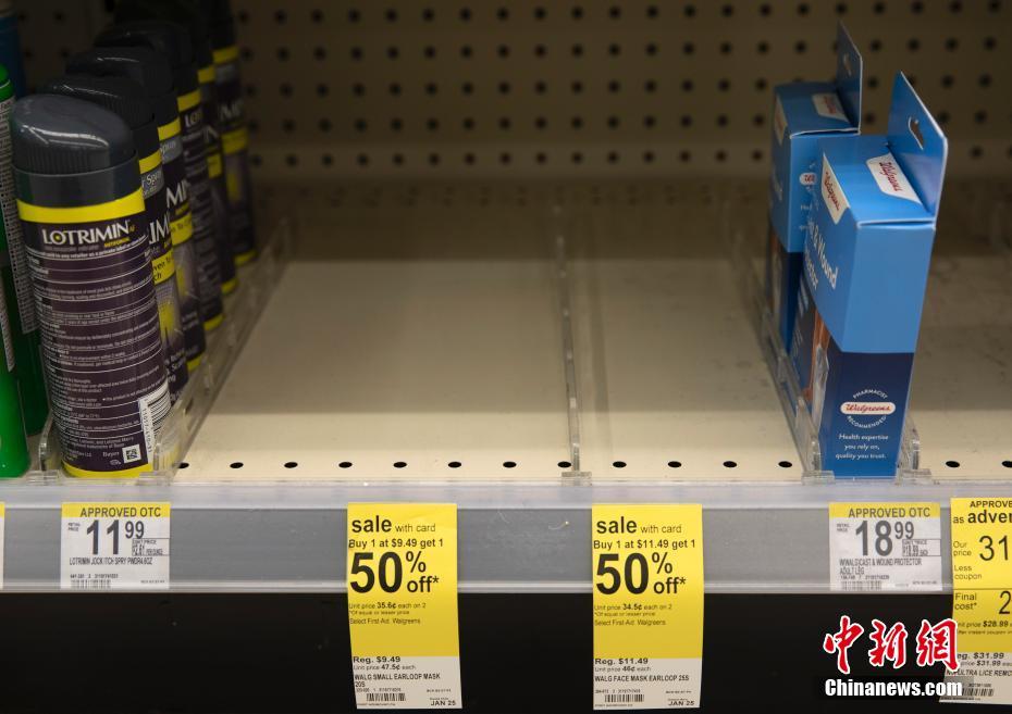 当地时间1月25日,美国旧金山湾区圣马特奥县的一家药店里,口罩已经脱销。当日,记者走访的多家旧金山湾区药店里,口罩均已售罄。美国疾控中心24日宣布,发现第二名感染新型冠状病毒的肺炎患者。中新社记者 刘关关 摄