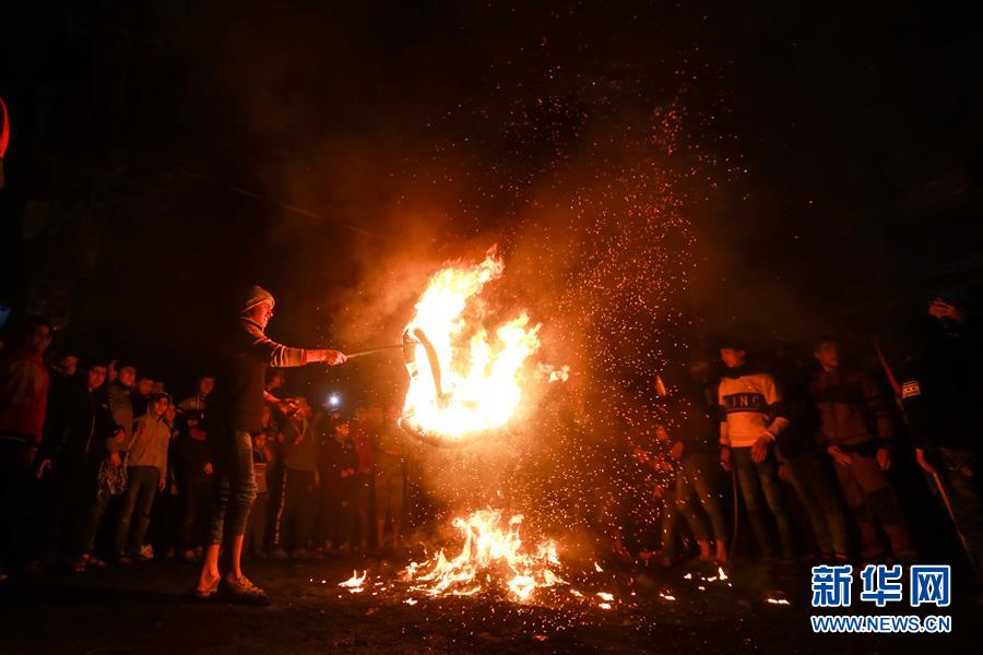 1月28日,在加沙城,巴勒斯坦示威者焚烧轮胎。 美国总统特朗普28日公布了所谓推动解决巴勒斯坦与以色列问题的“世纪协议”后,巴勒斯坦方面明确表示拒绝协议的全部内容,大批民众举行罢工、游行等活动,抵制该协议。 新华社发(里泽克·阿卜杜勒贾瓦德摄)