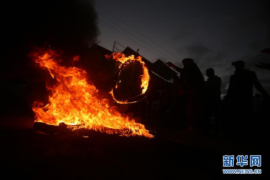 1月28日,在加沙地带南部的拉法,巴勒斯坦示威者焚烧轮胎。 美国总统特朗普28日公布了所谓推动解决巴勒斯坦与以色列问题的“世纪协议”后,巴勒斯坦方面明确表示拒绝协议的全部内容,大批民众举行罢工、游行等活动,抵制该协议。 新华社发(哈立德·奥马尔摄)