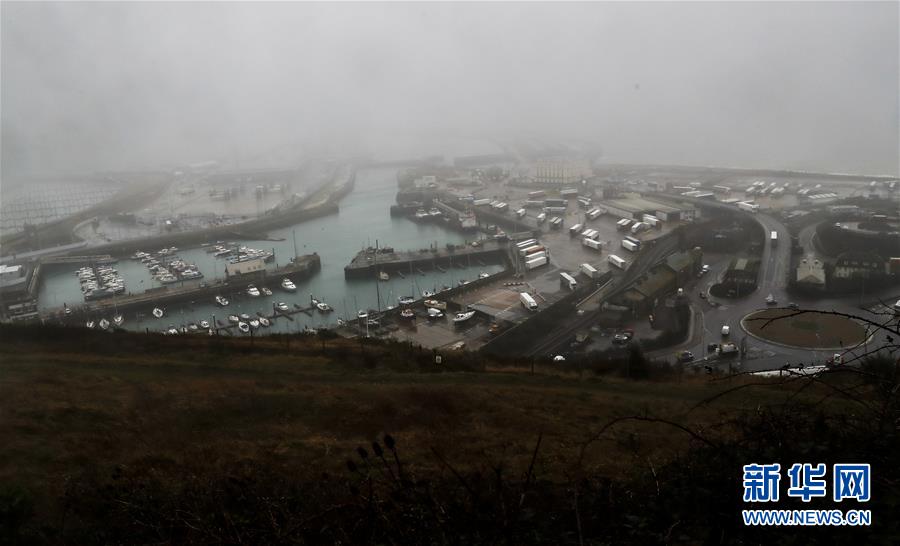 这是1月30日在英国东南部城市多佛拍摄的雨雾笼罩下的多佛港。新华社记者 韩岩 摄